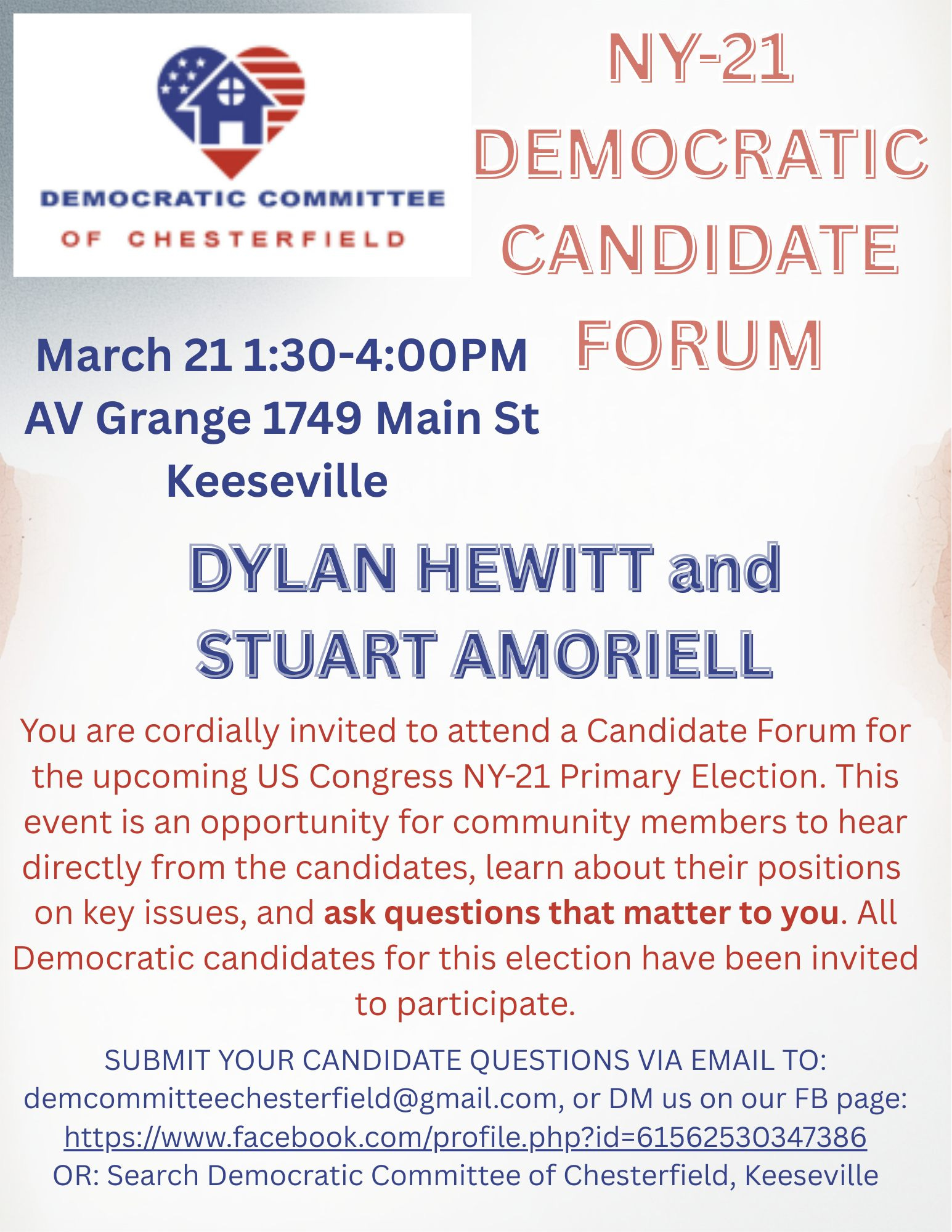Make sure you are an informed voter! This event on Saturday March 21 at 1:30pm is sponsored by the Democratic Committee of Chesterfield. Do you have a question for the candidates? See the poster below for how to submit it before the Forum.