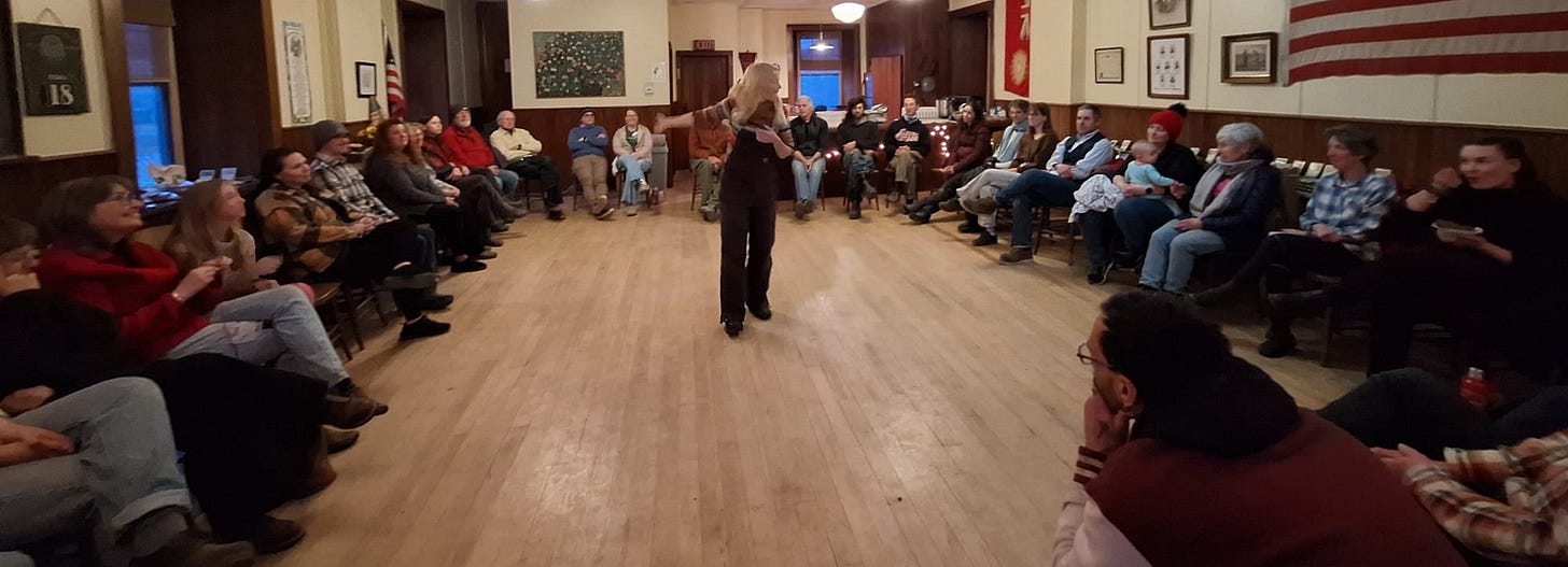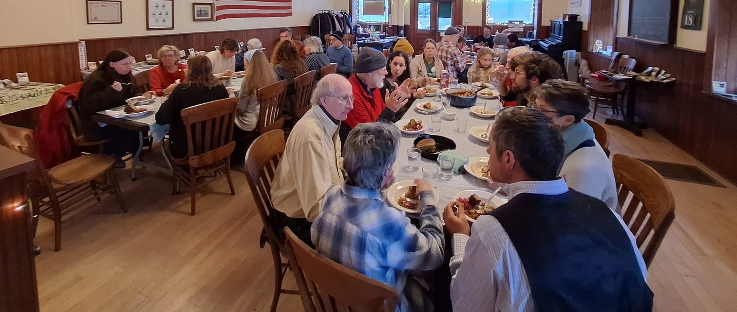 Last night we were overwhelmed with Gratitude at the AuSable Valley Grange, as over three dozen folks gathered for the very first Sand River/Fruition Seeds/Grange collaboration meal. The Grange celebrated their emergence from hibernation by welcoming us to their cozy space, and we shared fellowship and conversation over a delicious dinner of our totally farm-sourced Chili, Corn Bread and Sauerkraut. Afterwards we were mesmerized by Petra’s gracious and articulate invitations to not only remember our childhood gardens, but imagine our future gardens as well.