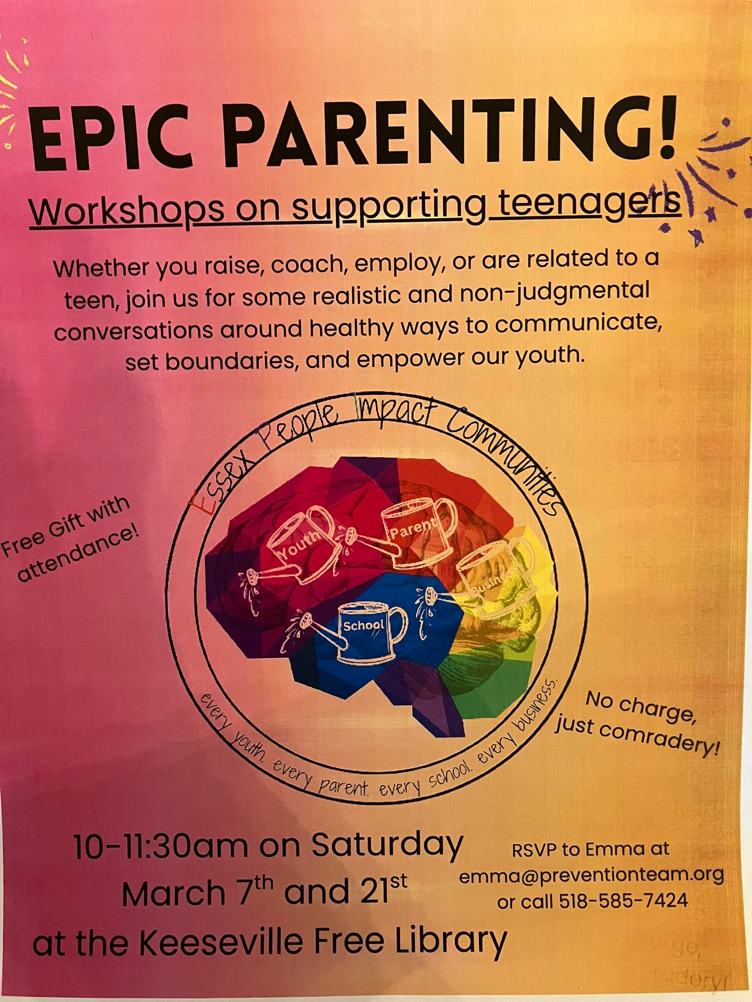 Join us this Saturday March 21 from 10-11:30am. Reserve your place by calling 518-585-7424 or send an email to Emma, emma@preventionteam.org